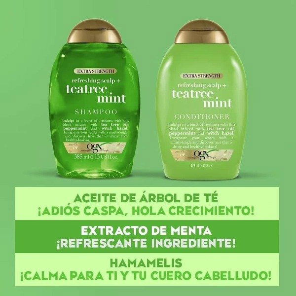 EXPLOSIÓN DE FRESCURA: Infundido con aceite de árbol de té, menta y hamamelis, el shampoo OGX Extra Strength Refreshing Scalp + Tea Tree Mint le dará un reinicio al cabello y al cuero cabelludo, llevando a cabo una limpieza profunda sin eliminar sus barreras naturales.