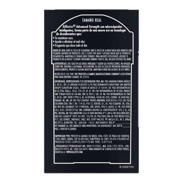 • Gillette Advanced Strength con microcápsulas inteligentes, forma parte de una nueva era en tecnología de desodorantes que: ayuda a eliminar el mal olor y fragancia que dura todo el día