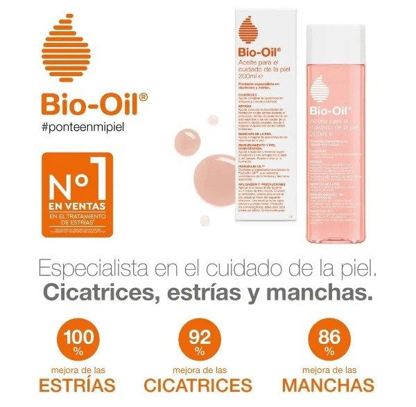 Bio-Oil Body Oil es uno de los productos más utilizados a nivel mundial para mejorar cicatrices y estrías. Con una mezcla única de aceites vegetales esenciales y vitaminas, no solo ayuda a mejorar las cicatrices, las estrías y el tono desigual de la piel, sino que también ayuda a hidratar, tonificar y suavizar la piel.
