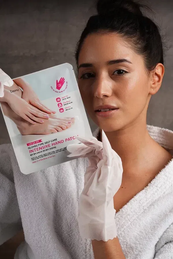 2. Cuando estén limpias y secas, retire los guantes del envase y colóqueselos en las manos, distribuyendo las esencias con suaves masajes.