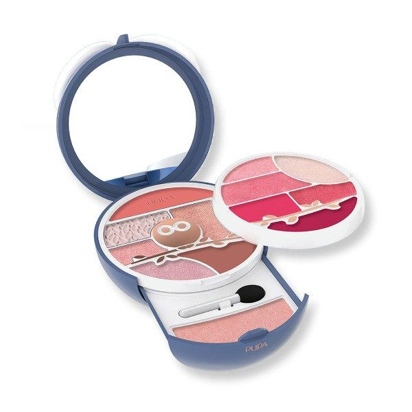 Pupa Owl 3 contiene: 1 Rubor,1 Compact Eyes, 1 Primer, 5 Sombras de ojos compactas, 1 aplicador de ojos Labios, 4 Lápices labiales en crema, 1 Brillo, 1 Bálsamo labial