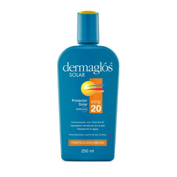 Protector Dermaglós Solar FPS 20 con protección UVA y UVB con vitamina A x 250 ml resistente al agua.
