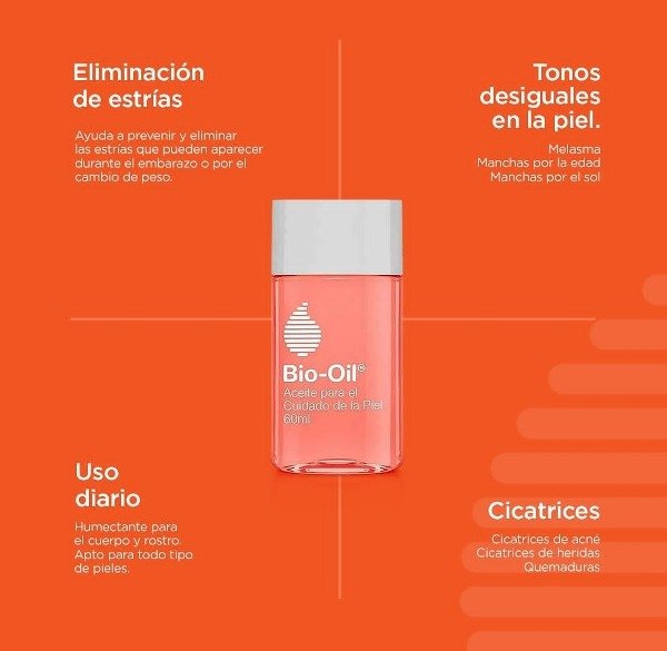 Bio-Oil® es un aceite dermocosmético formulado para la reparación cutánea y el cuidado de la piel que ayuda a mejorar visiblemente el aspecto de estrías, cicatrices, manchas de la piel.