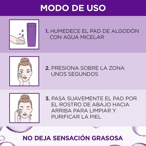 Aplicar sobre el rostro, ojos y labios con un algodón. Sin necesidad de frotar, ni enjuagar. Utilizar en la mañana y/o en la noche.