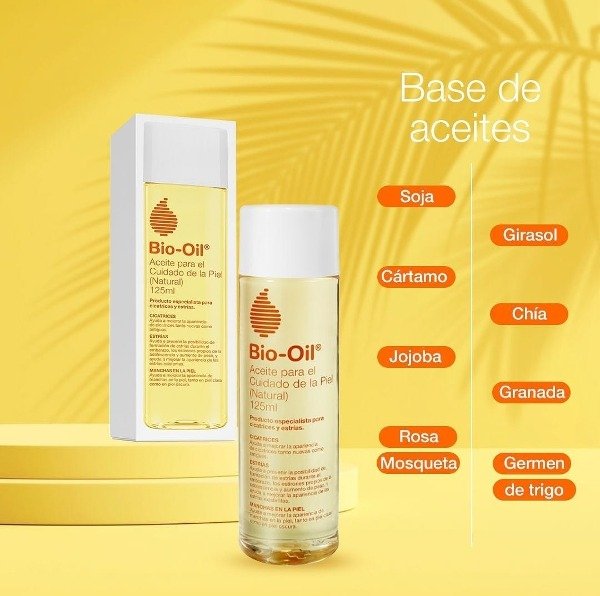 Bio Oil Natural combina 14 aceites naturales de propiedades medicinales (Jojoba, Lavanda, Romero, Caléndula, Manzanilla, Vitamina A, Vitamina E, Rosa Mosqueta, Chia) para lograr una piel hidratada, elástica y radiante. Es de rápida absorción y no deja residuos grasos tras su aplicación.