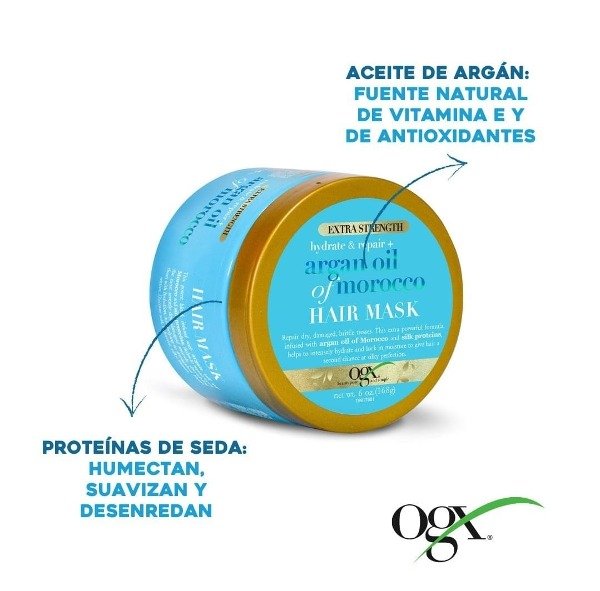 Eleva la categoría de tu cabello con esta mascarilla supercremosa. La fórmula extrapoderosa de la mascarilla para el cabello OGX® Hydrate & Repair + Argan Oil of Morocco hidrata intensamente y conserva la humedad. Con aceite de argán marroquí y proteínas de seda, esta mezcla cremosa desenreda, aporta hidratación superior y libera la fuerza natural del cabello. ¡Dale una segunda oportunidad a tu cabello con la perfección de la seda! Empapa tu cabello con una mezcla poderosa de la Colección OGX® Extra Strength Argan Oil of Morocco.