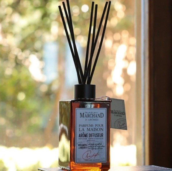 Exclusiva botella de vidrio color ámbar de 200 ml, varillas color negro, etiqueta enológica, tag con info de la linea, todo dentro de un estuche hecho con compromiso de gestión ambiental.