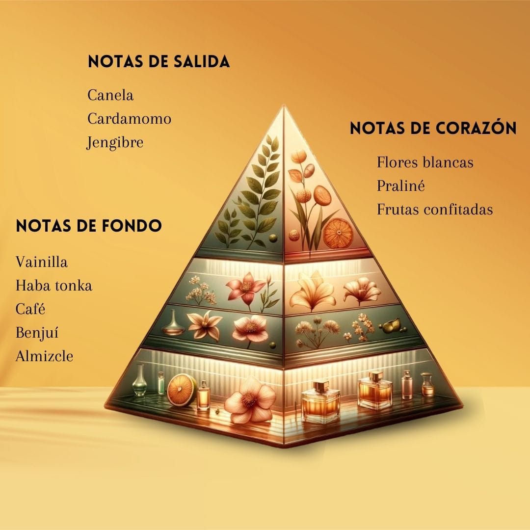 ✨ Preludio Especiado: La fragancia se abre con un torbellino de especias cálidas: canela, cardamomo y jengibre te envuelven en una atmósfera acogedora y vibrante.